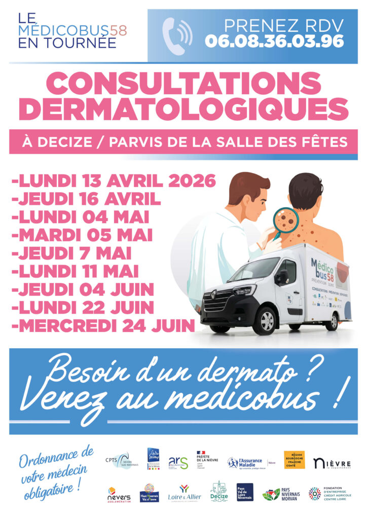 En parallèle de ces avancées structurelles, des réponses immédiates se mettent en place. Le Médicobus 58 arrive à Decize pour des consultations dermatologiques — neuf dates entre avril et juin, sur le parvis de la salle des fêtes.