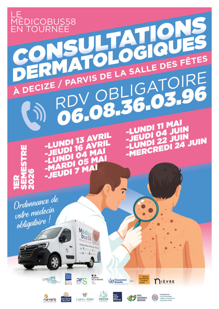 Le Médicobus 58 s’installera parvis de la salle des fêtes pour des consultations dermatologiques. Neuf dates sur le 1er semestre, de mi-avril à fin juin. Pour ceux qui attendent un rendez-vous dermato depuis des mois — et ils sont nombreux — c’est une vraie bouffée d’air.